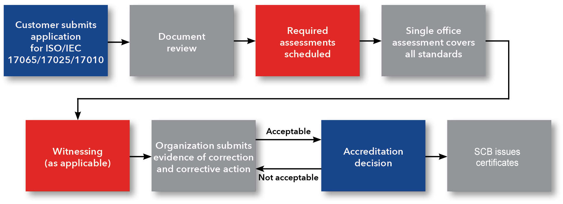 SCB offers a single accreditation program for conformity assessment bodies providing product certification, testing and/or inspection services. Testing and inspection activities are integral to operations of product certification organizations. Many companies seeking ISO/IEC 17065 accreditation also require accreditation to ISO/IEC 17025 for their labs. This is also the case with ISO/IEC 17020 for inspection agencies. Our program offers combined assessments in both instances.